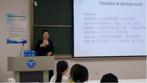 2025届毕业生薛丽莎和任祎婧担任主讲,他们围绕英语留学准备的全程规划及雅思学习等展开分享,吸引众多学子参与。